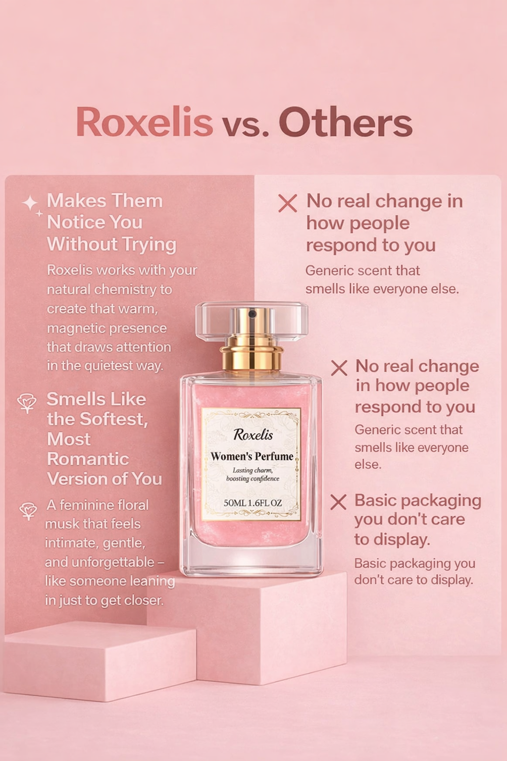Its feminine floral-musk blend works with your natural chemistry, creating a warm, magnetic presence that other generic fragrances simply can’t replicate. While most perfumes fade into the background, Roxelis lingers softly on the skin, drawing people in throughout the day without ever being overpowering. Every note is intentionally chosen to make you feel confident, romantic, and effortlessly noticed the moment you walk into a room. Unlike mass-produced scents, Roxelis offers a signature aroma that feels intimate, luxurious, and uniquely yours. This is the fragrance women choose when they want to stand out—not blend in—and that’s why Roxelis rises above every competitor.
